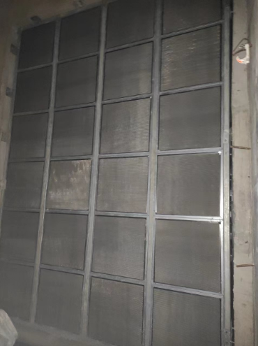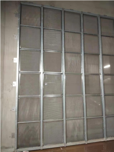 过滤器安装在新风通道,安装截面尺寸可达20平方米,最高高度达5米以上。由多个过滤器模块组合拼装为一面过滤器墙,该设计方案类似我公司为武汉康宁玻璃项目提供的初效过滤器墙(G4 无纺布过滤器)。